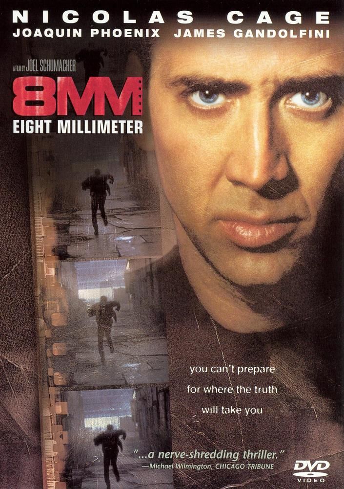 | Eight Milimeter. A private investigator is hired to discover if a "snuff film" is authentic or not. Nicolas cage and Joaquin Phoenix star. |